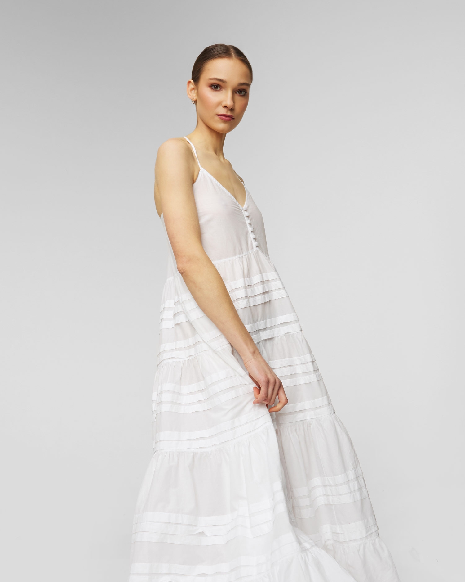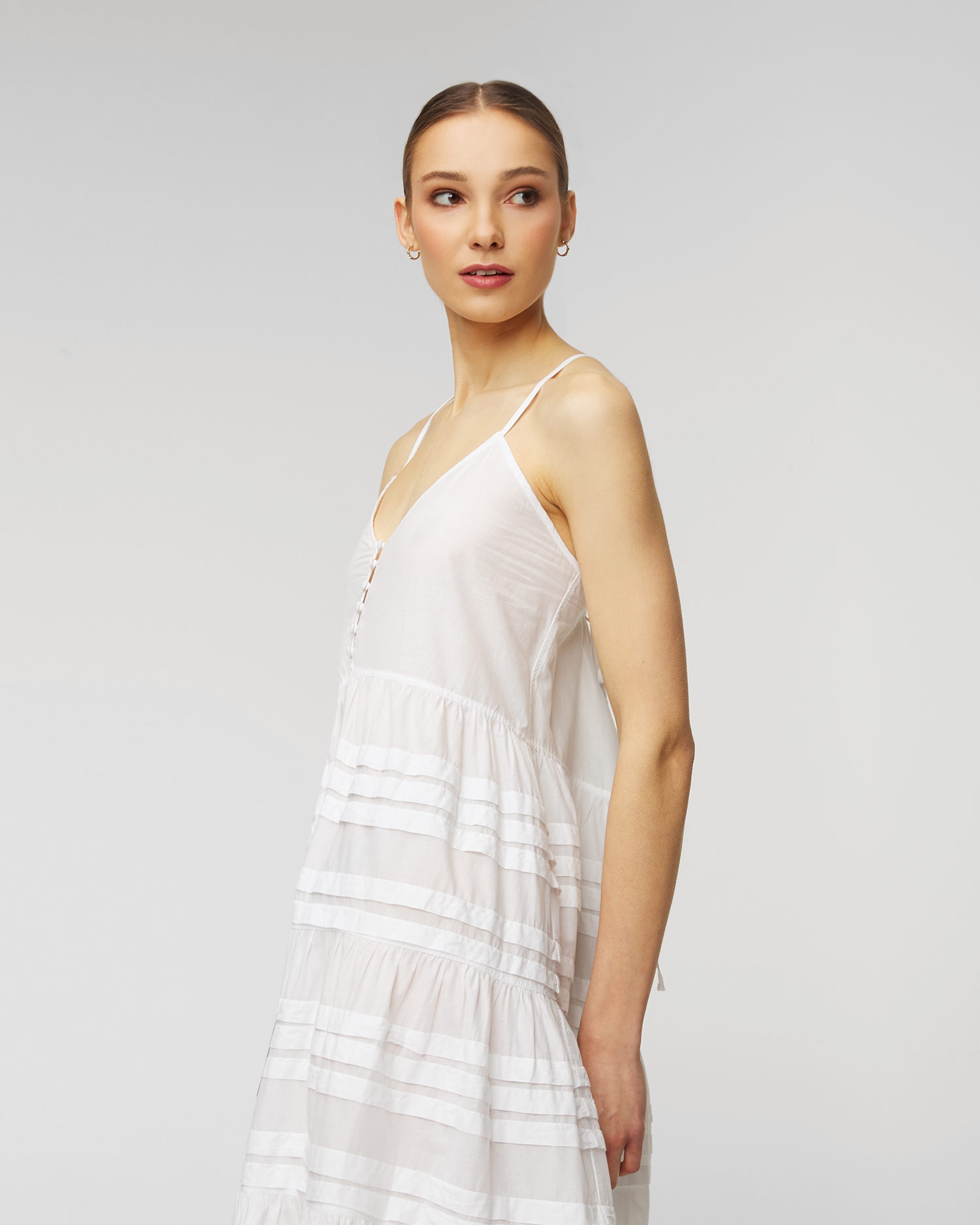 Rochia maxi DEVOTION FTELIA este o alegere lejeră, ideală ca bază pentru garderoba de vară. Confecționată din bumbac moale și respirabil, ce asigură confort în zilele toride. Croiala lejeră în forma literei A subliniază delicat forma siluetei și colaborează excelent cu mișcările corpului. Bretele înguste, ajustabile cu legătură la spate. Decolteu în V, închis cu nasturi. Rochia atrage atenția prin partea de jos largă și cu volane.