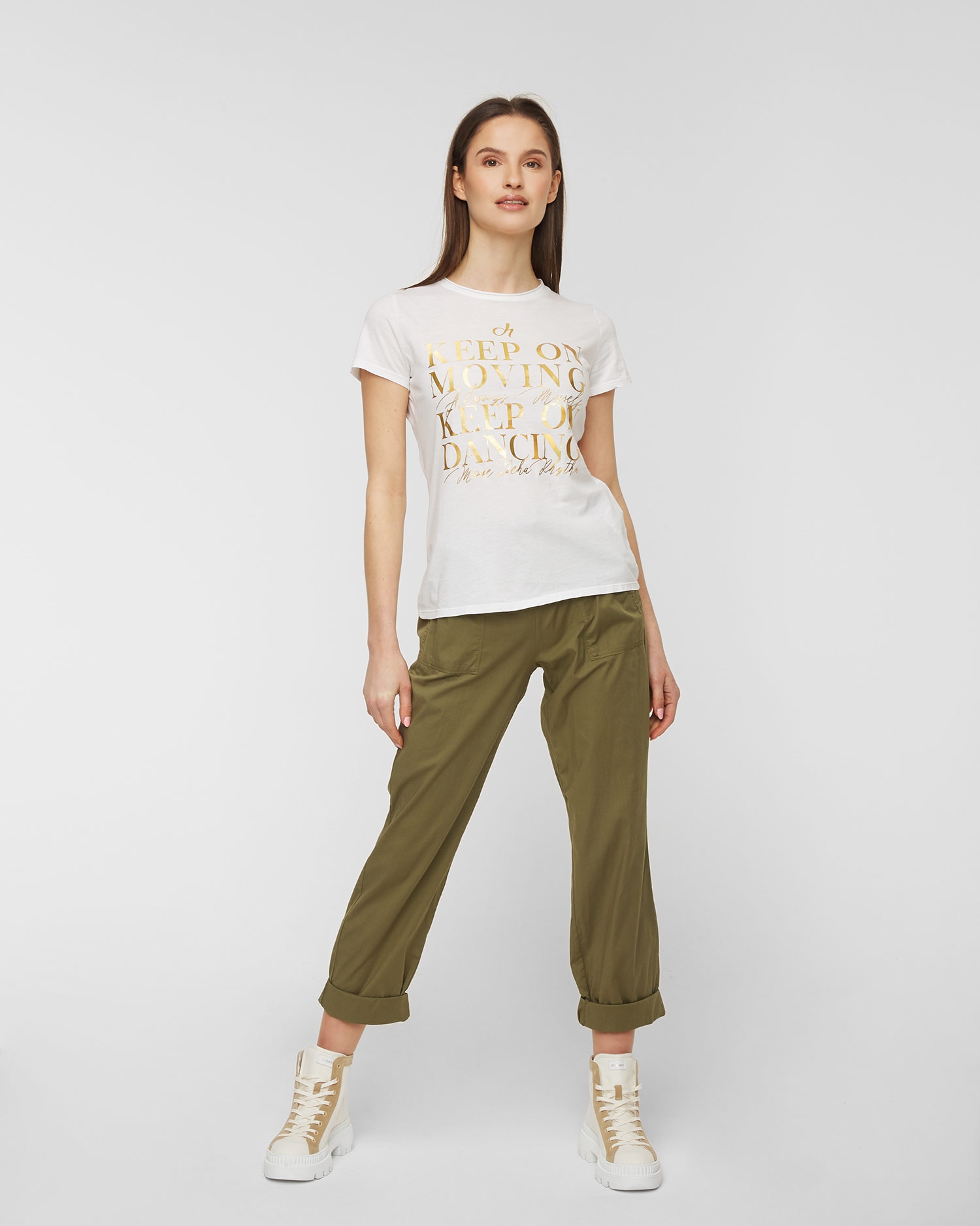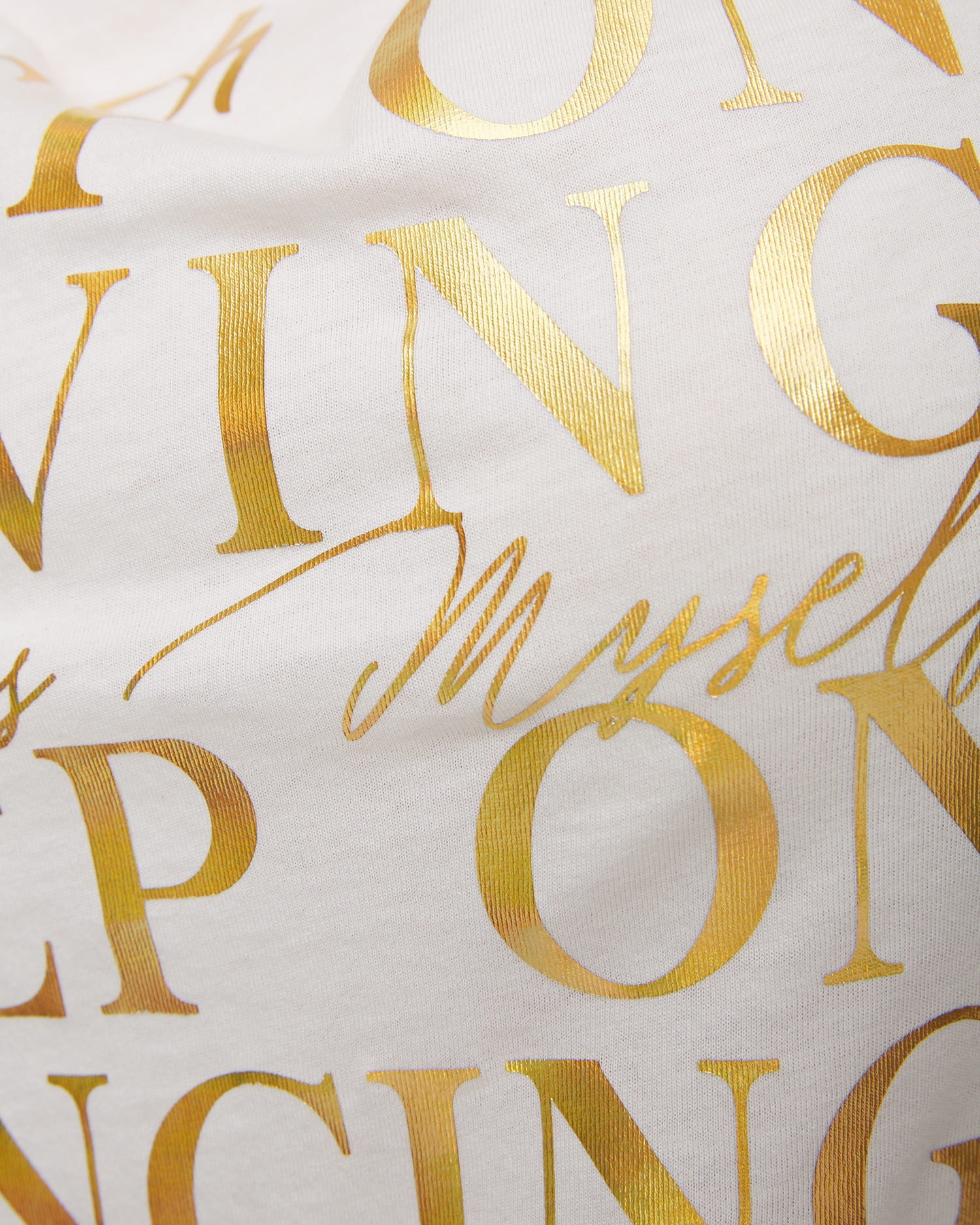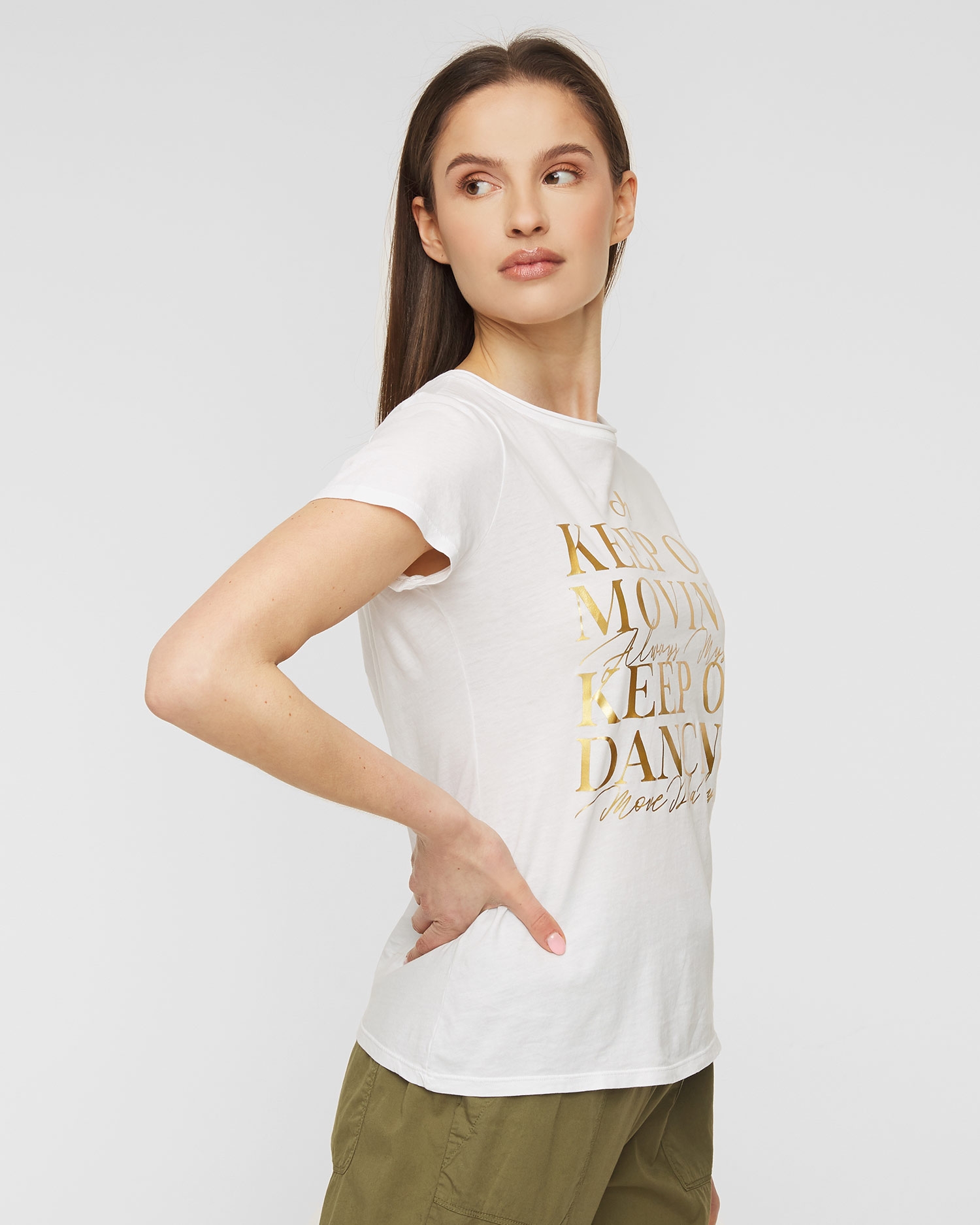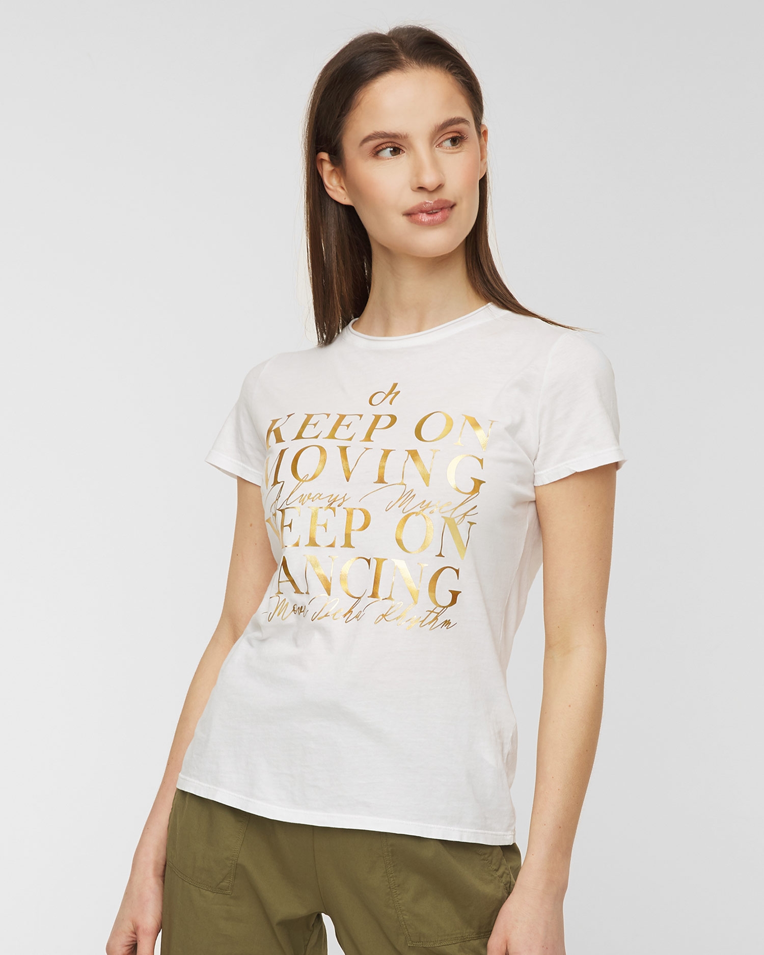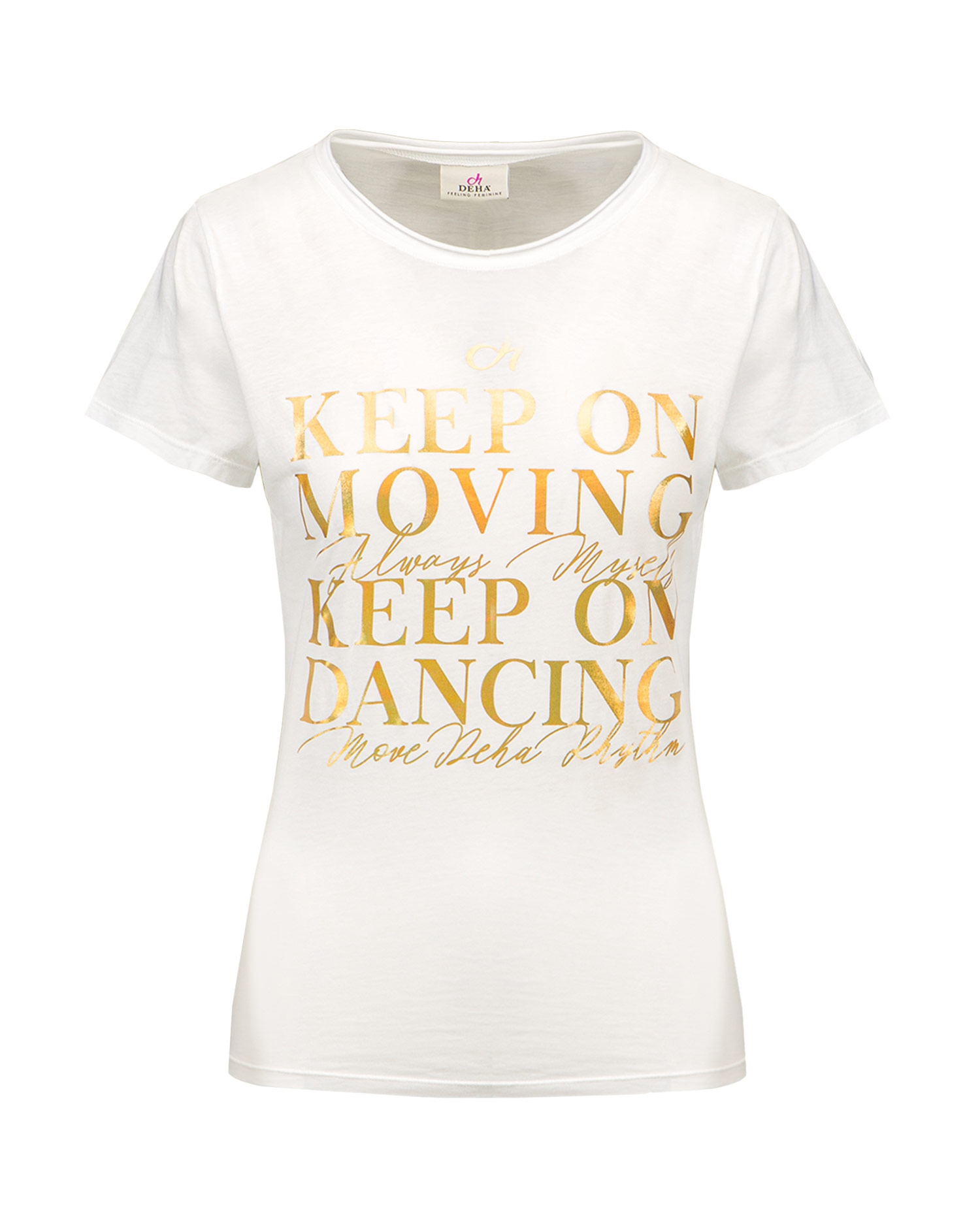 Tricoul DEHA MOVE atrage atenția prin imprimeul auriu. Este ideal nu numai pentru dans, ci și pentru utilizarea de zi cu zi. Confecționat din bumbac organic. Decolteu rotund, finisat brut. Pe spate o etichetă semnată.