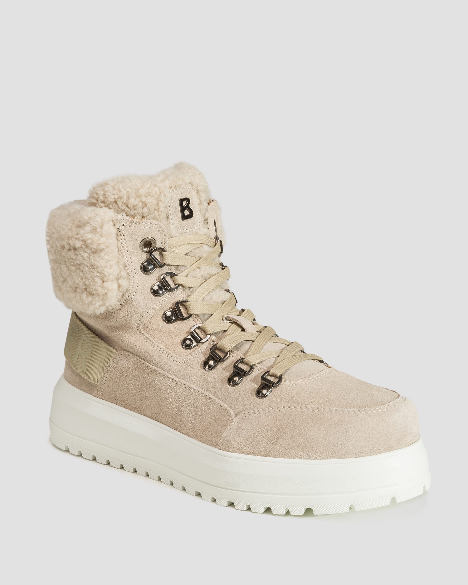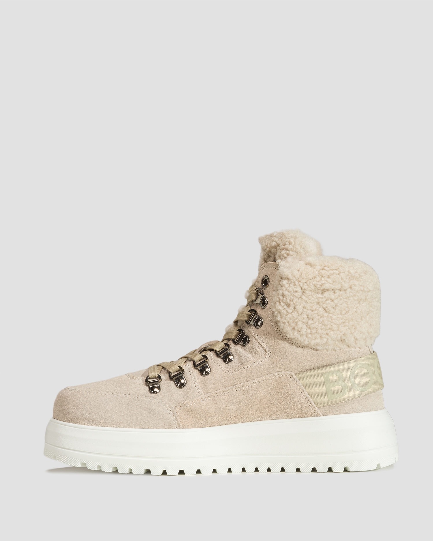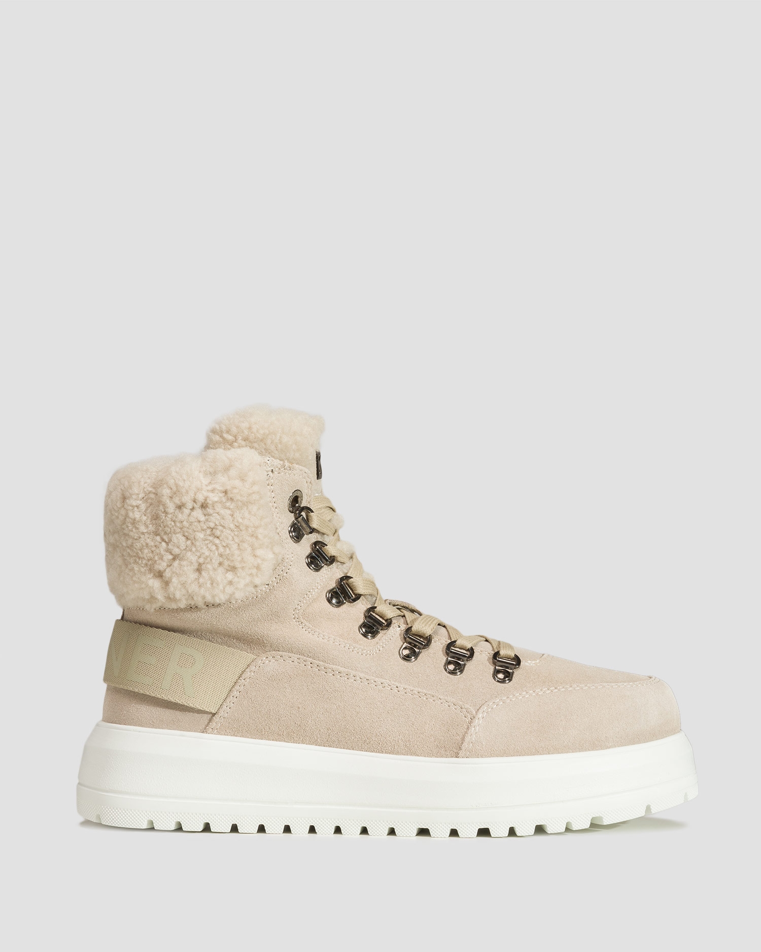 Zvršok je kombináciou dvoch luxusných materiálov - mäkkého, jemného jahňacieho semišu a strihanej vlny. Päta obopnutá označkovanou páskou. Podšívka z mäkkej a teplej jahňacej kože zaručuje vynikajúcu tepelnú izoláciu a absorpciu vlhkosti, vďaka čomu budú Vaše nohy v suchu a pohodlí. Šnurovanie v horskom štýle, umožňuje, aby topánka dokonale sedela na nohe.