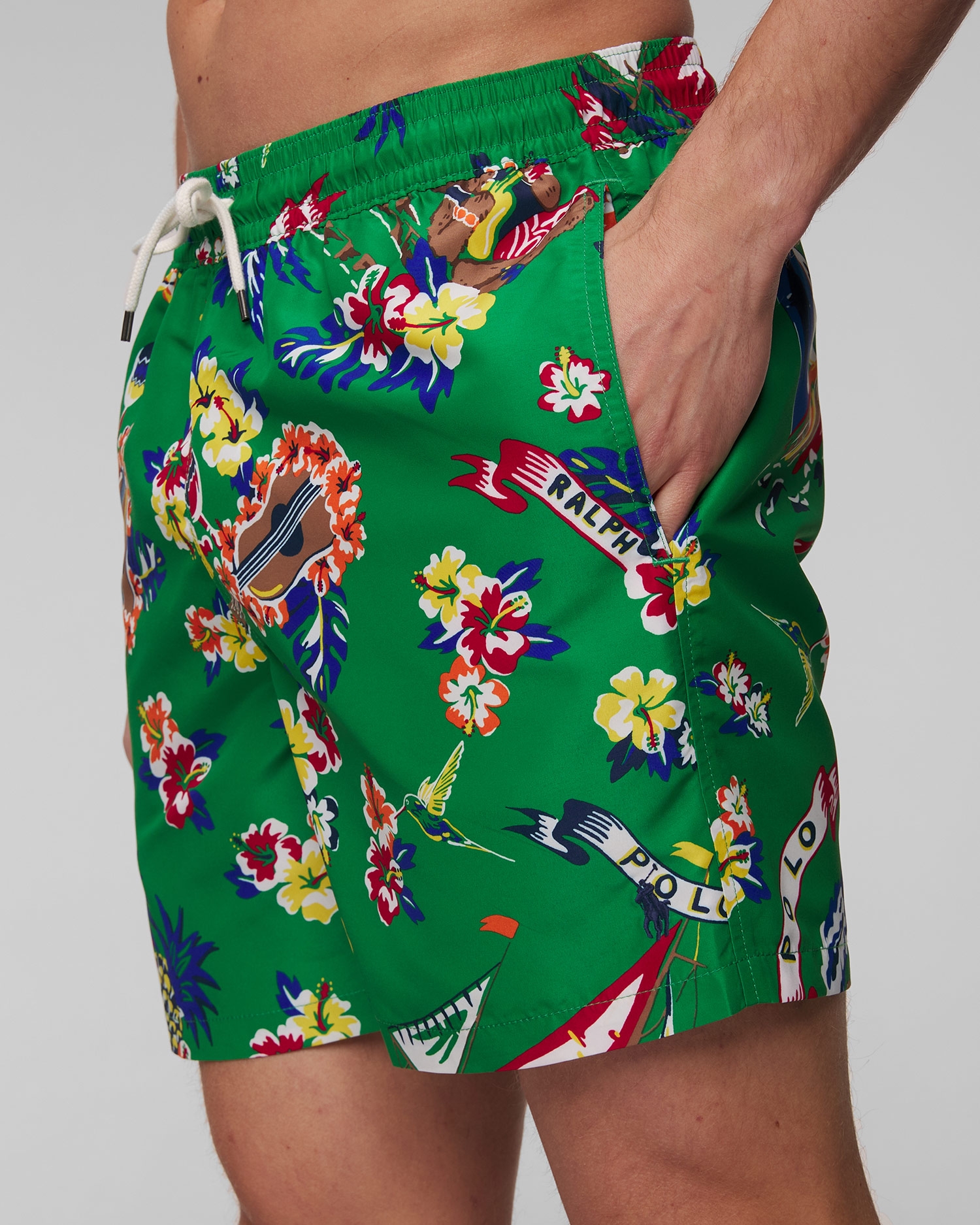 Pánske zelené kúpacie šortky Polo Ralph Lauren zdobené dovolenkovým motívom s medvedíkom Polo v trópoch. Vyrobené z extrémne ľahkej, recyklovanej a rýchloschnúcej tkaniny. Klasický strih a nastaviteľný elastický pás vám umožnia optimálne prispôsobenie postave. Šortky s dvoma bočnými vreckami a dodatočným vreckom na zadnej strane.