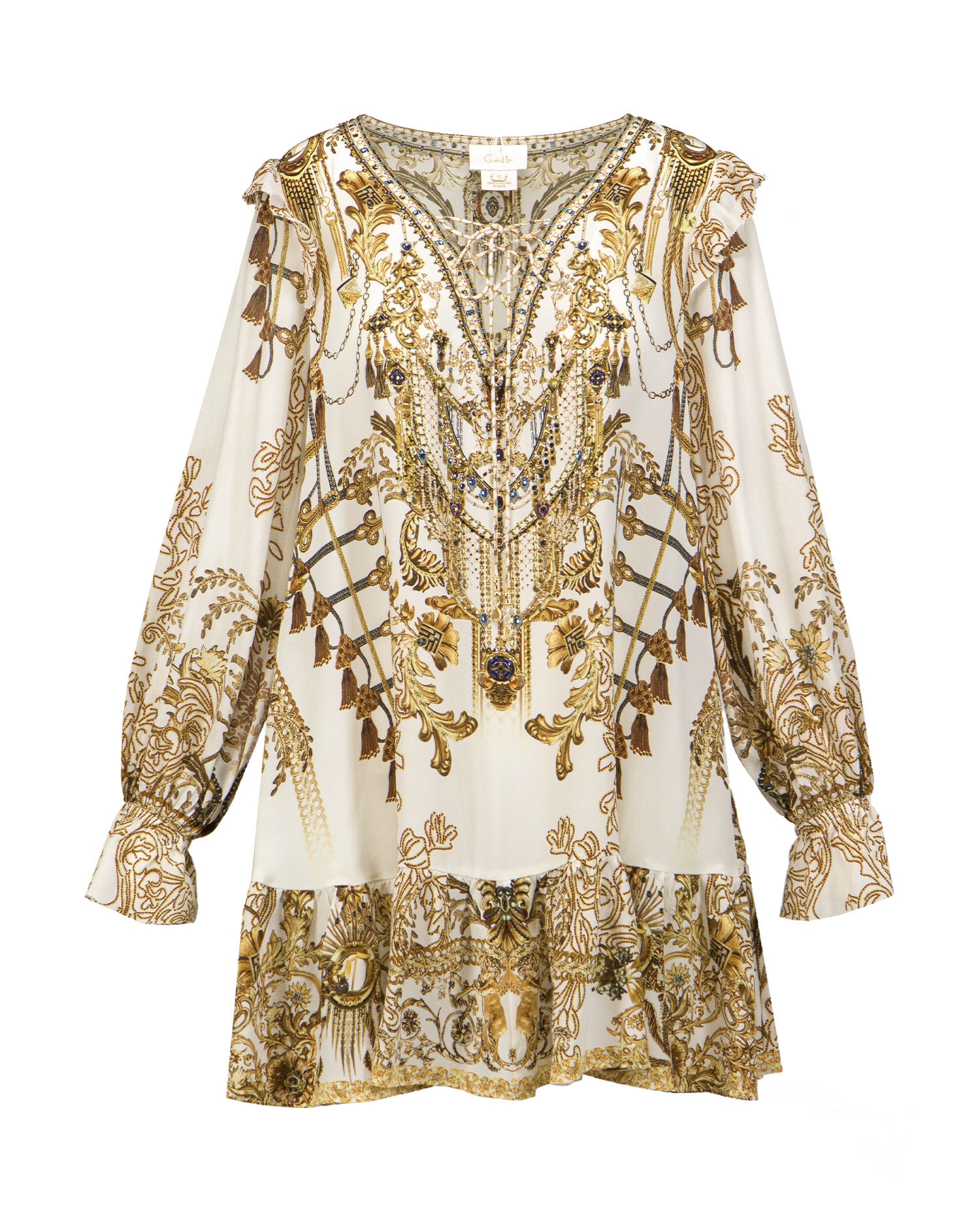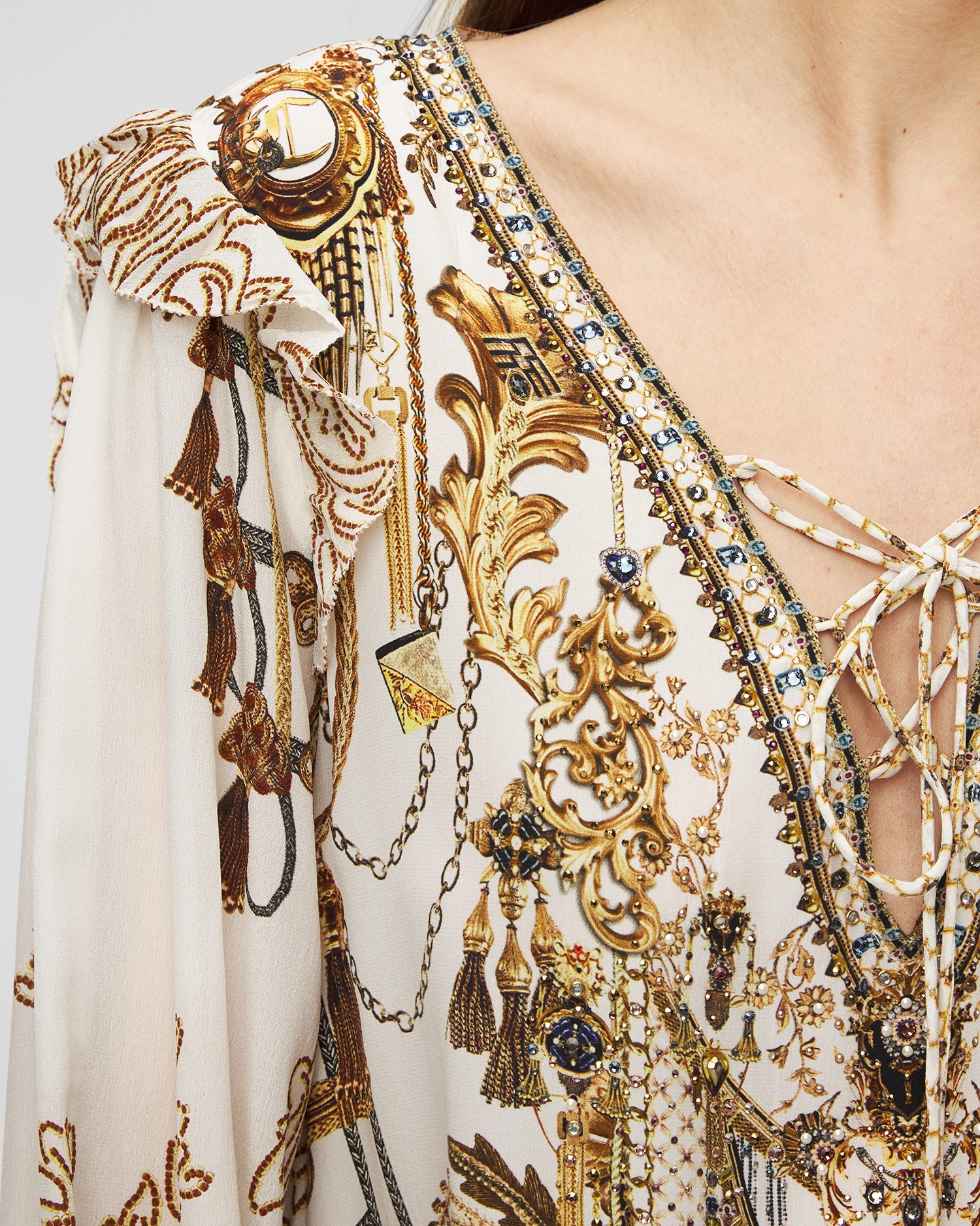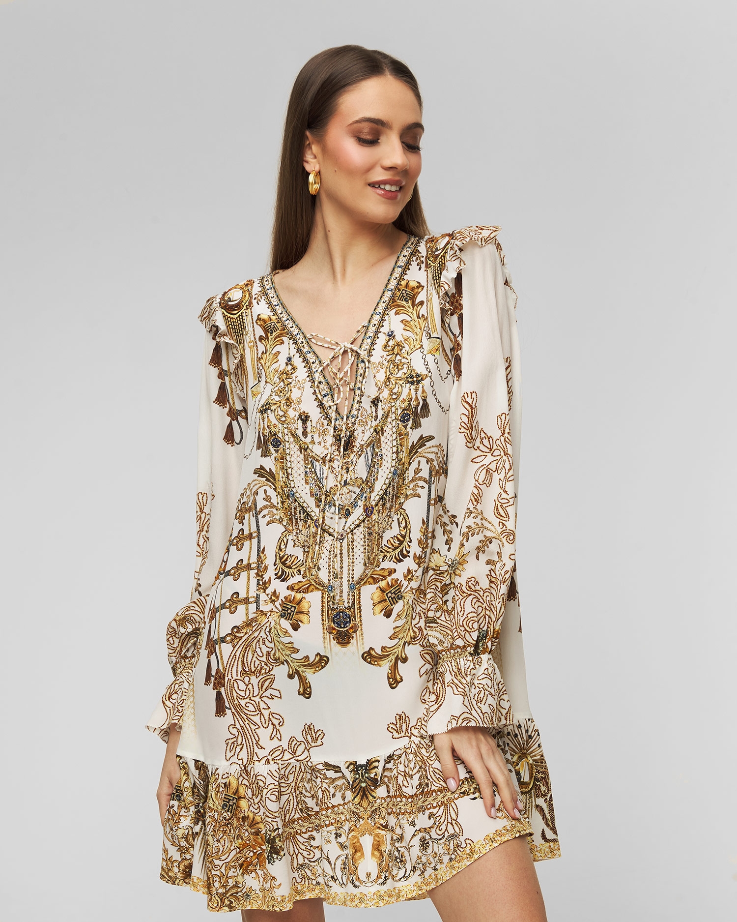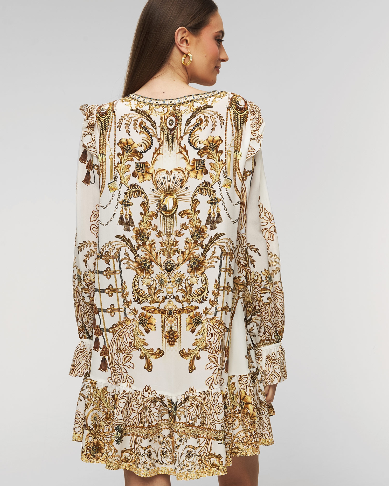 Hodvábne šaty Camilla Ruffle Lace Up s potlačou Road to Richesse očaria svojou ľahkosťou a vzdušnosťou. Ponorené do bielych a slonovinových odtieňov, bohato zdobené zlatými ornamentmi, ktoré tancujú medzi kvetinovými detailmi. Ležérny strih v tvare písmená A s rozšírenými rukávmi pre maximálne pohodlie. Dekolt ručne zdobený farebnými kryštálmi, previazaný šnúrkami so šperkovou úpravou. Spodok, ramená a rukávy s volánmi dodávajú šatám ľahkosť a vzdušnosť.