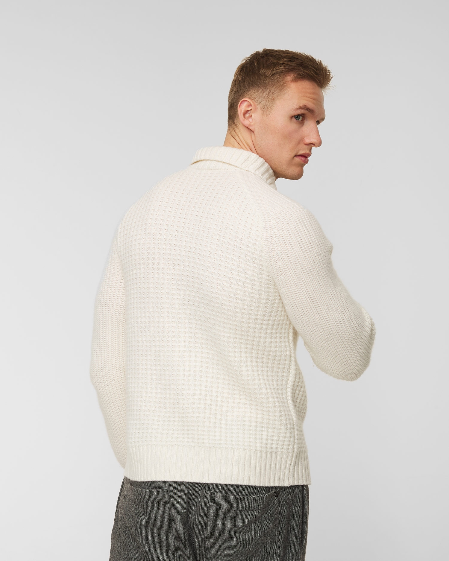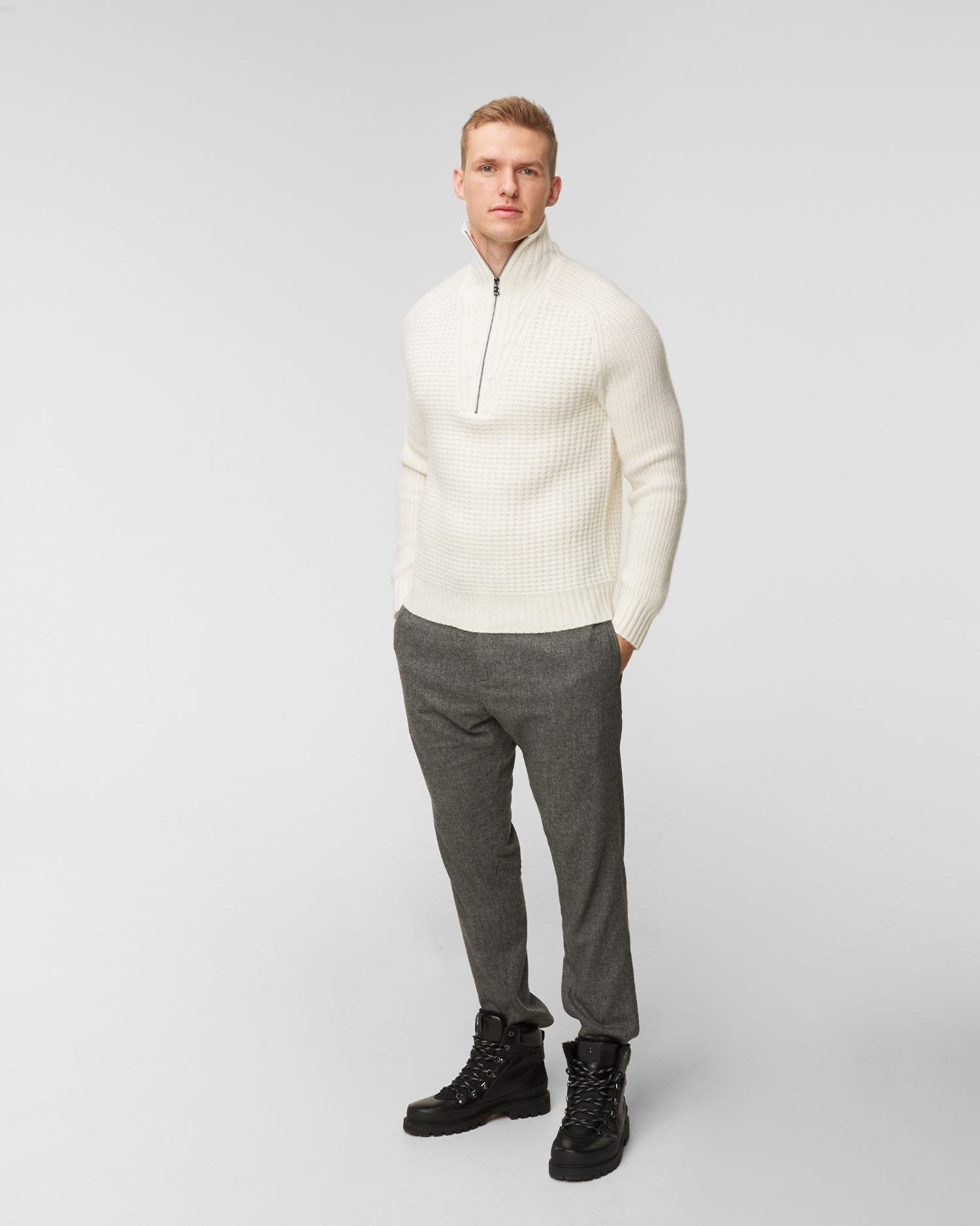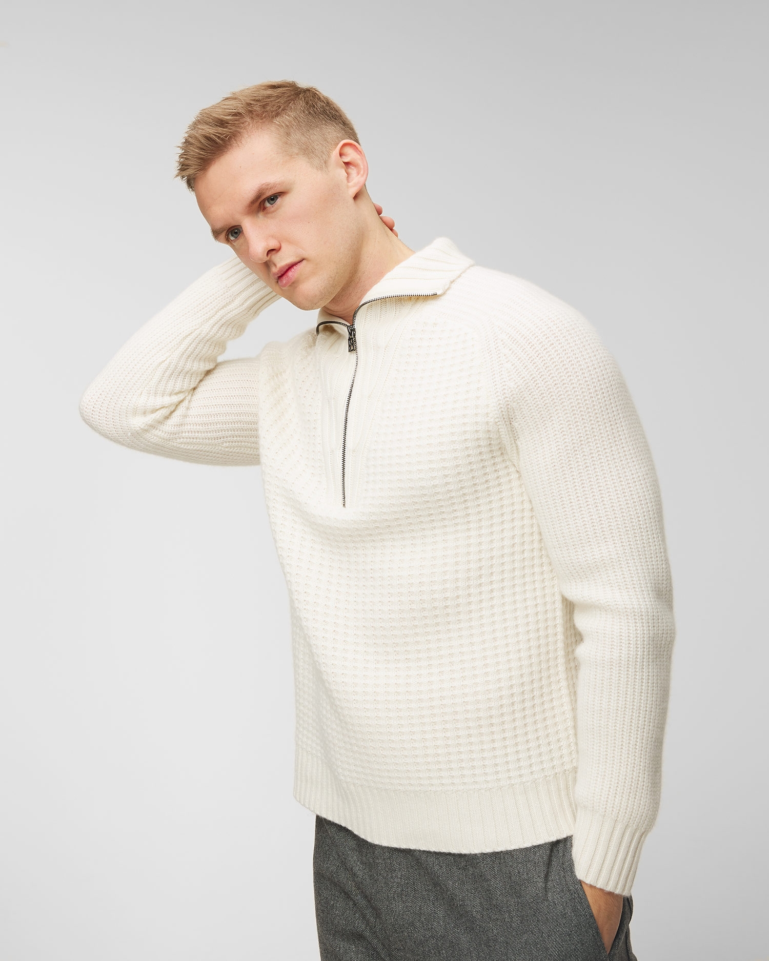 Kašmírový sveter BOGNER REY s klasickým stojačikom, zapínaný na zips s logom "B“, je veľmi všestranný a luxusný model. Úplet z čistého kašmíru obráteným stehom, ktorý ponúka výnimočný komfort. Raglánové rukávy v prúžkovanom prevedení.