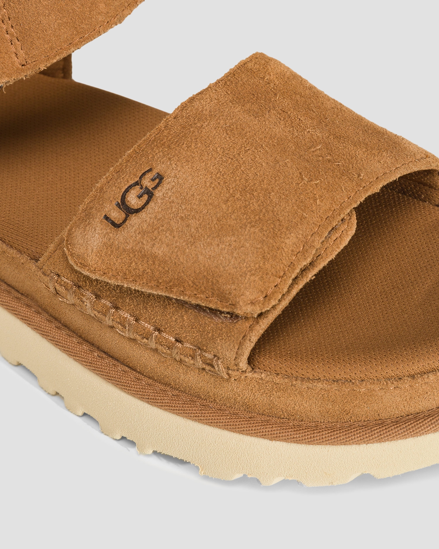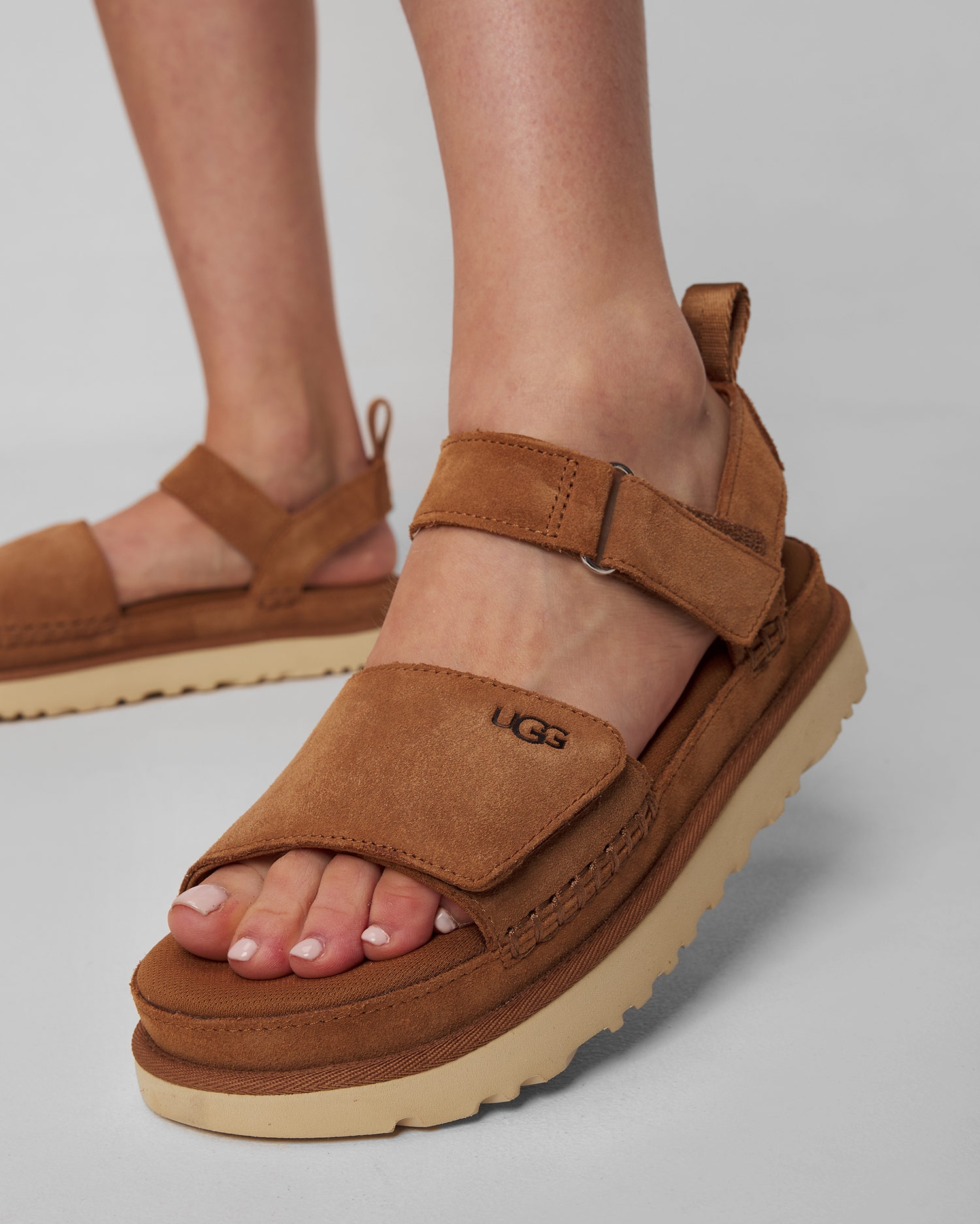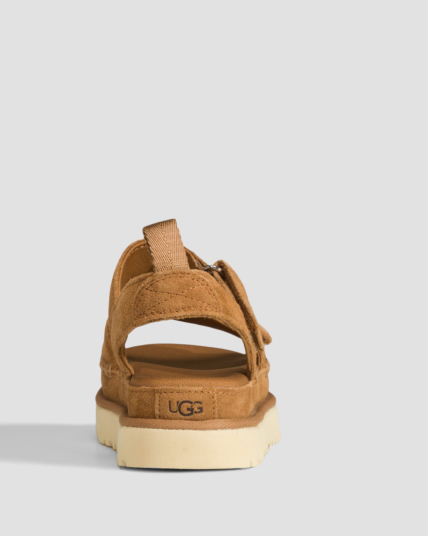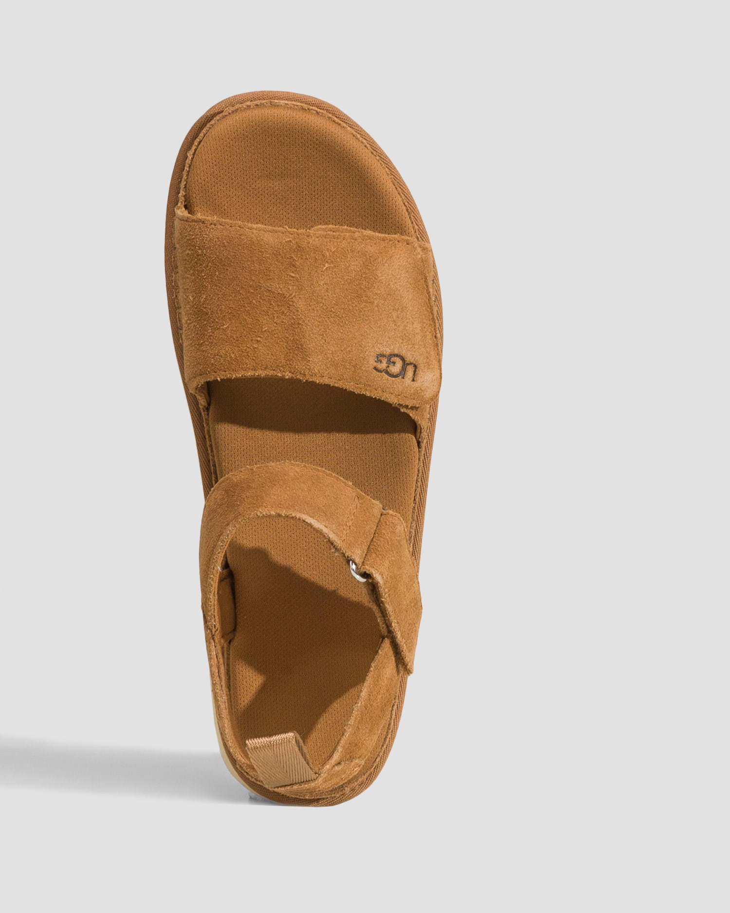 Sandále UGG Goldenstar v zamatovom semiši na malej platforme, vyrobené z materiálov s nízkym dopadom na životné prostredie. Ľahká a odolná penová podrážka SugarSole™ poskytuje pohodlie pri chôdzi. Model Goldenstar má dva nastaviteľné popruhy na suchý zips. Päta a podšívka zo 100% recyklovaných polyesterových vlákien. Razené logo značky na pásiku.