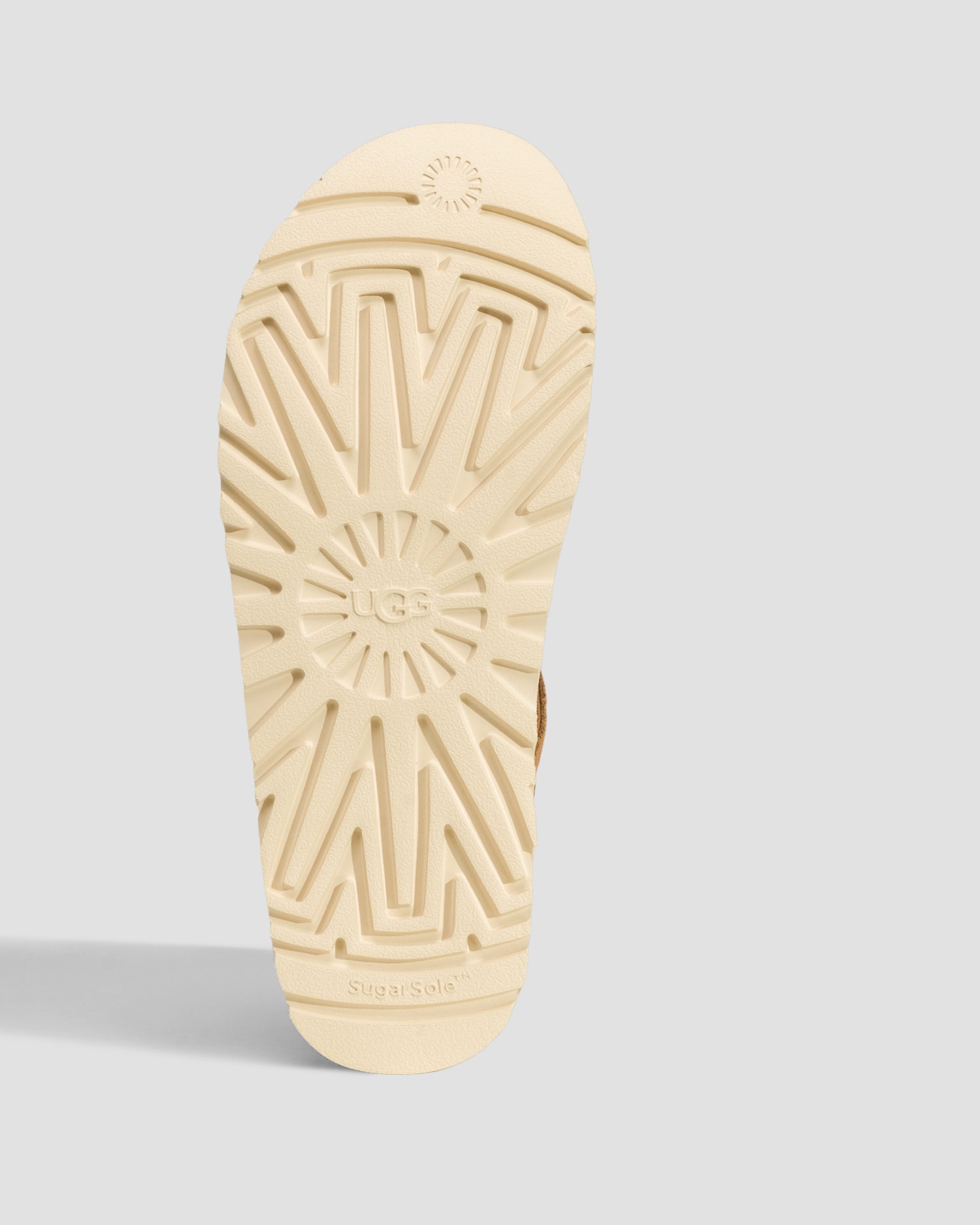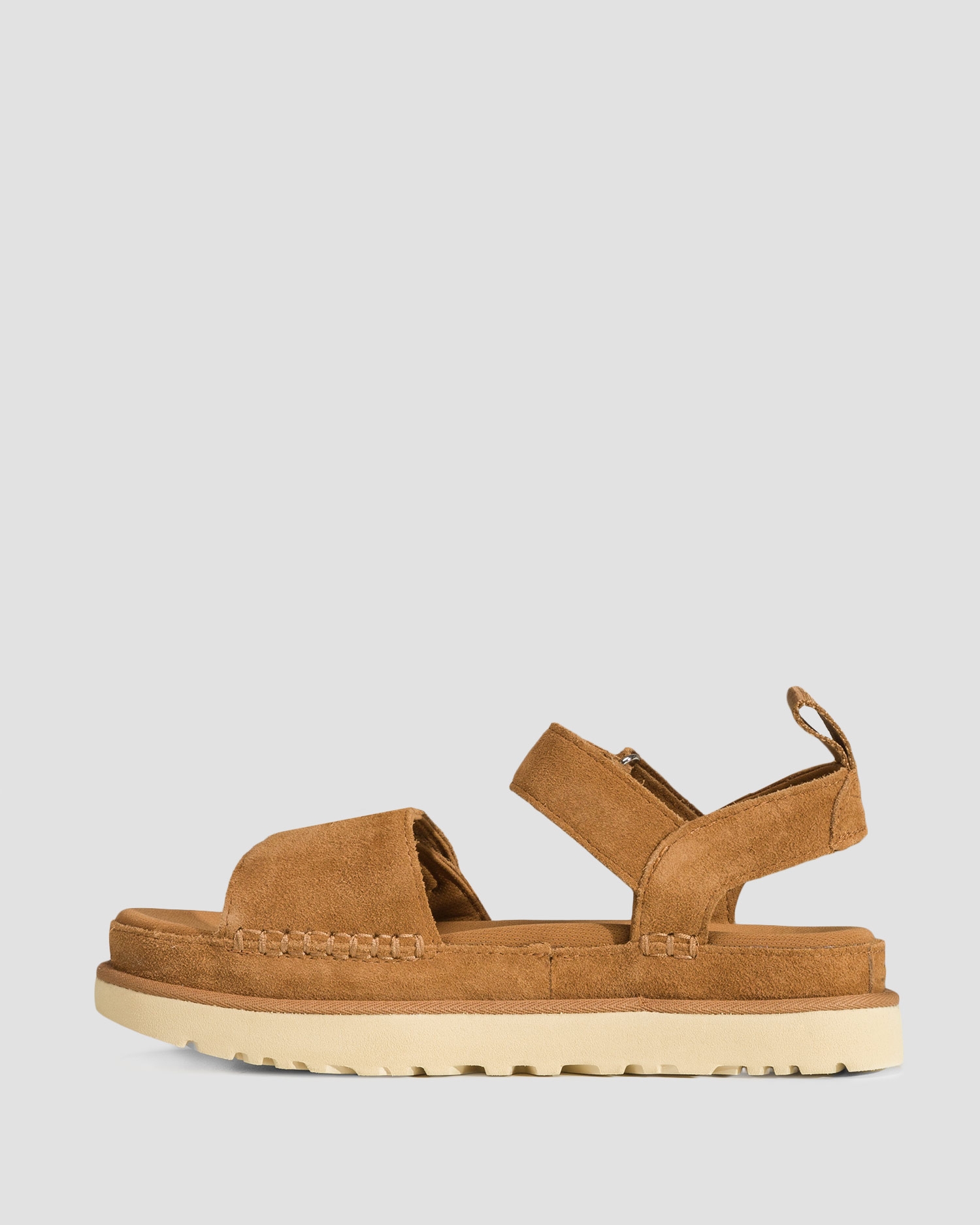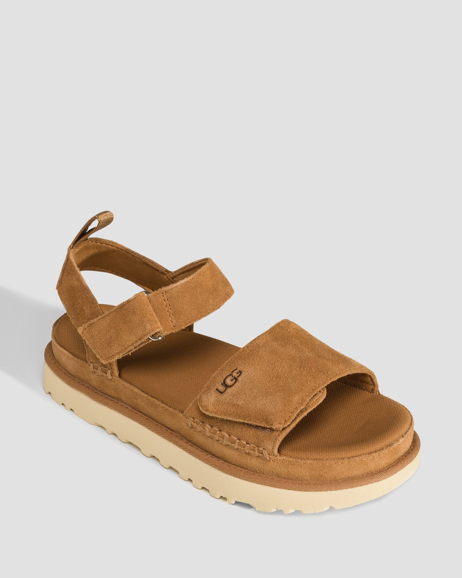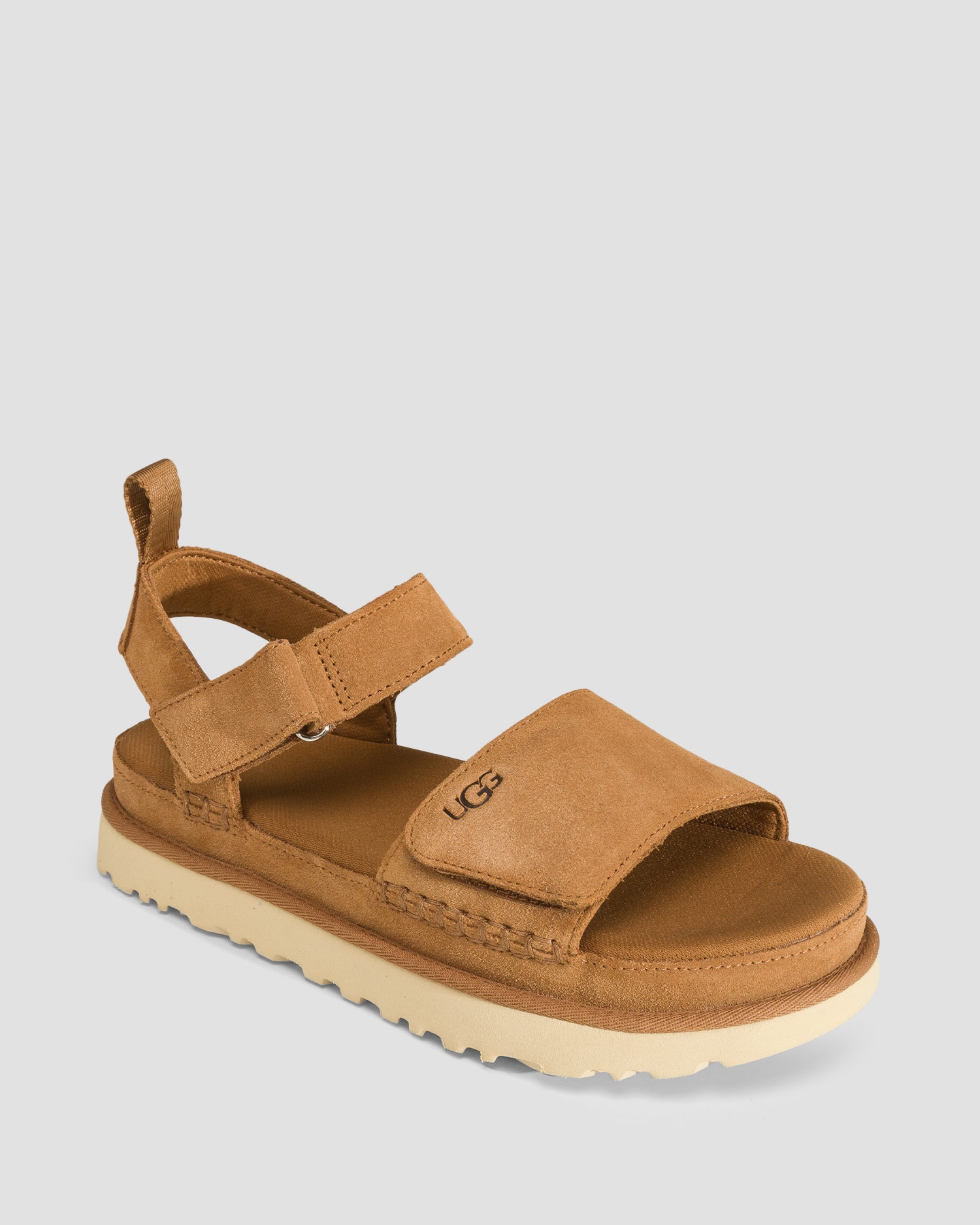 Sandále UGG Goldenstar v zamatovom semiši na malej platforme, vyrobené z materiálov s nízkym dopadom na životné prostredie. Ľahká a odolná penová podrážka SugarSole™ poskytuje pohodlie pri chôdzi. Model Goldenstar má dva nastaviteľné popruhy na suchý zips. Päta a podšívka zo 100% recyklovaných polyesterových vlákien. Razené logo značky na pásiku.