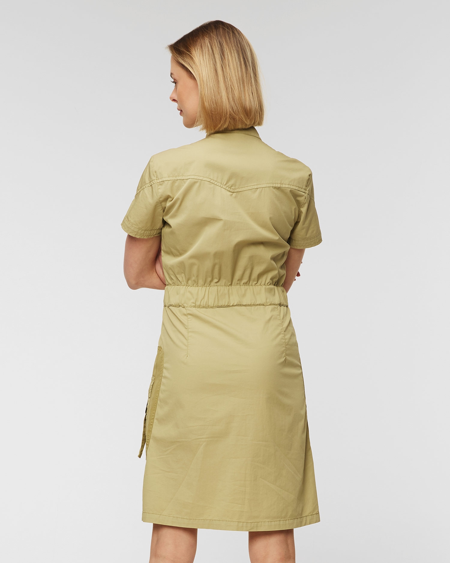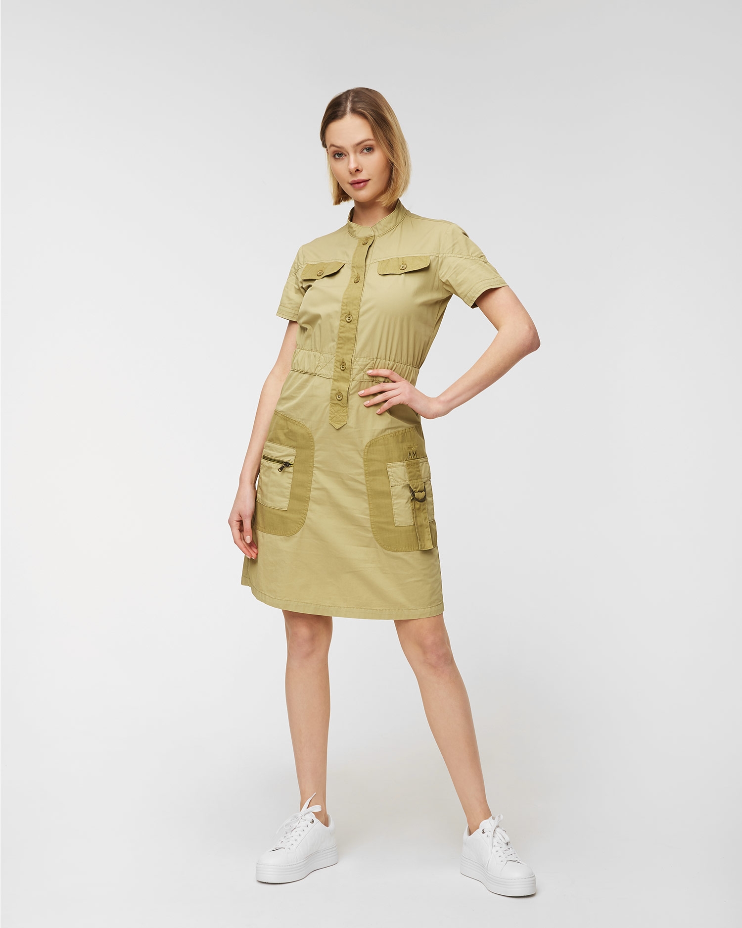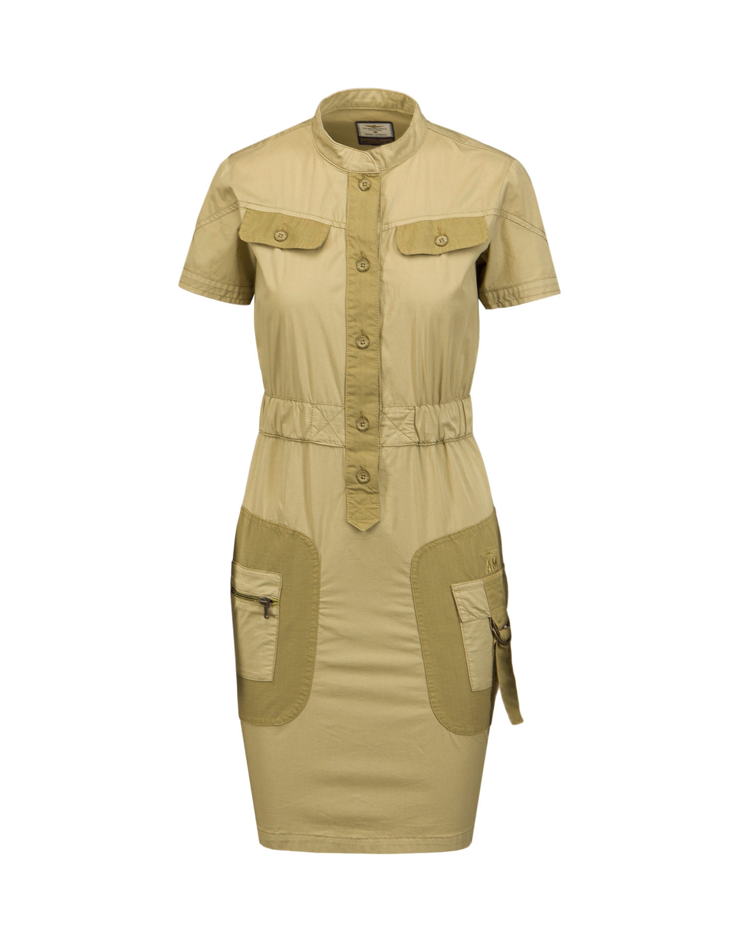 Šaty AERONAUTICA MILITARE sú ideálnou ponukou pre ženy, ktoré kladú dôraz na pohodlie a originalitu vo svojich každodenných štylizácií. Vyrobené z odolnej a elastickej bavlnenej tkaniny s prirodzenými priedušnými vlastnosťami, vďaka čomu poskytujú vysoký pocit pohodlia pri každodenných aktivitách. Elastický pás s všitou gumičkou zaistí optimálne prispôsobenie a zvýrazní tvar postavy. Vrchná časť šiat so zapínaním na gombíky - zaujme našitými patentkami imitujúcimi vrecká. Spodná časť šiat v tvare písmena A, s dvoma bočnými vreckami. Na ľavom vrecku vyšité ozdobné logo značky.