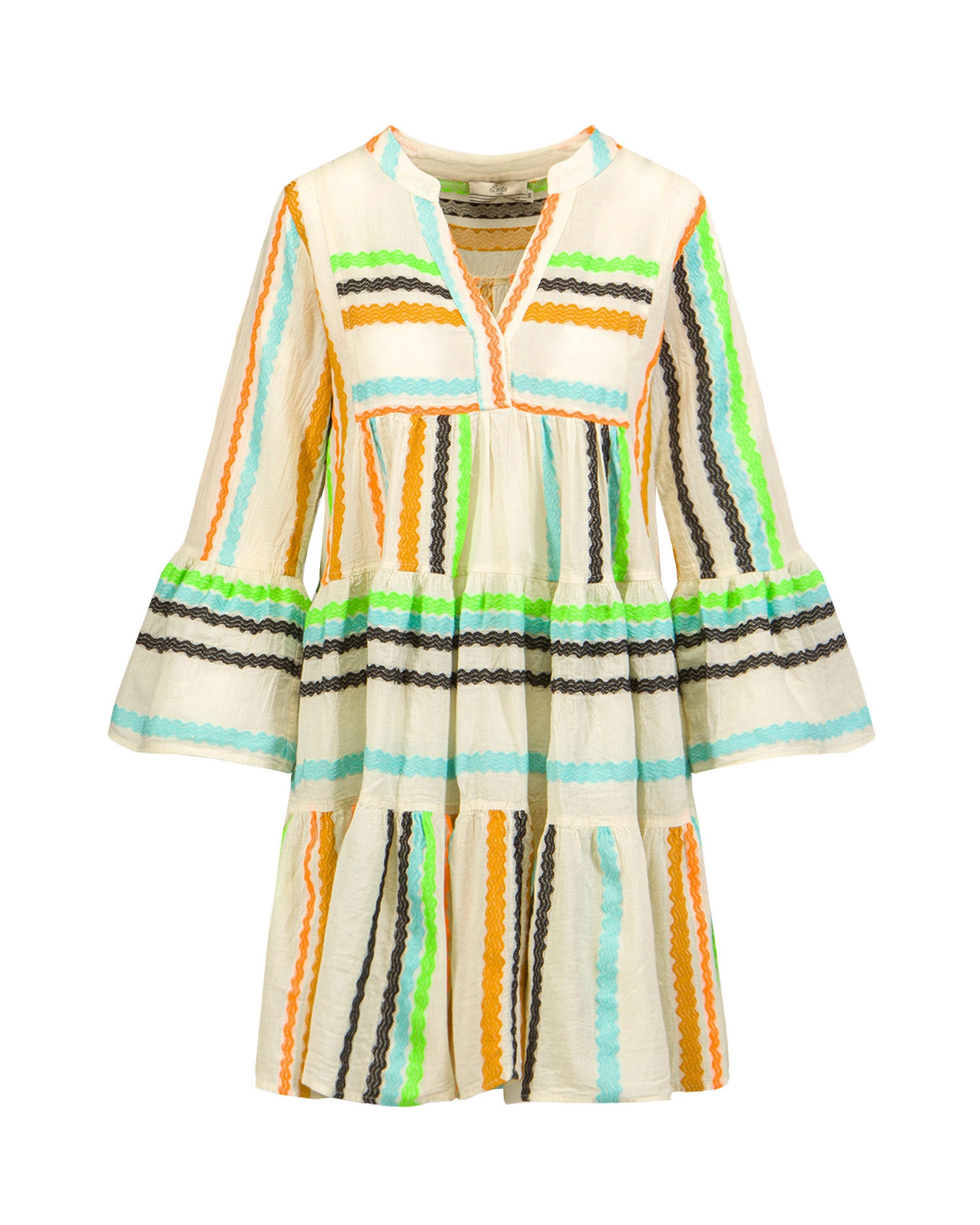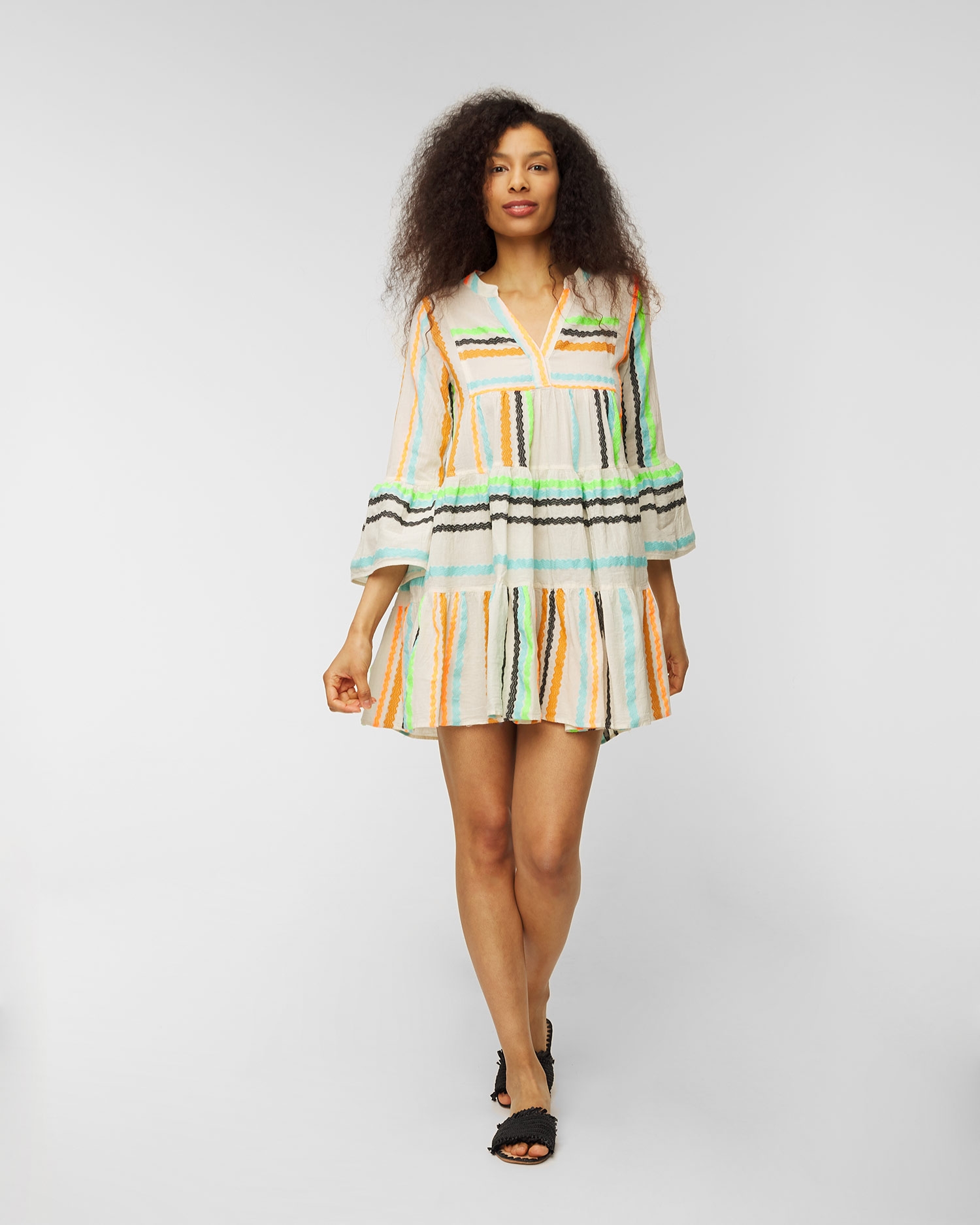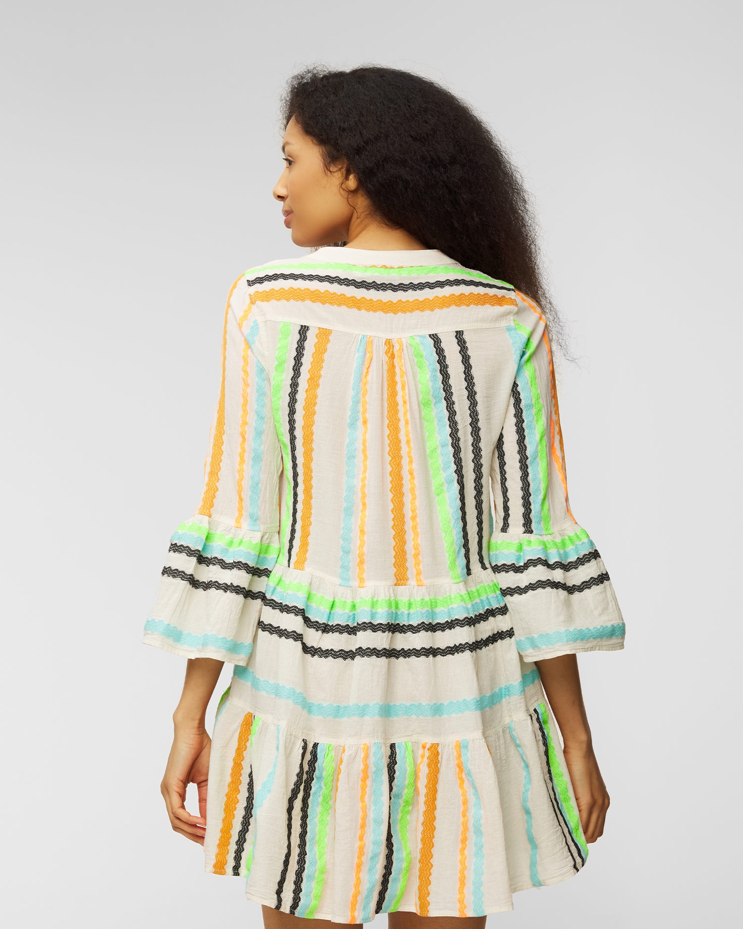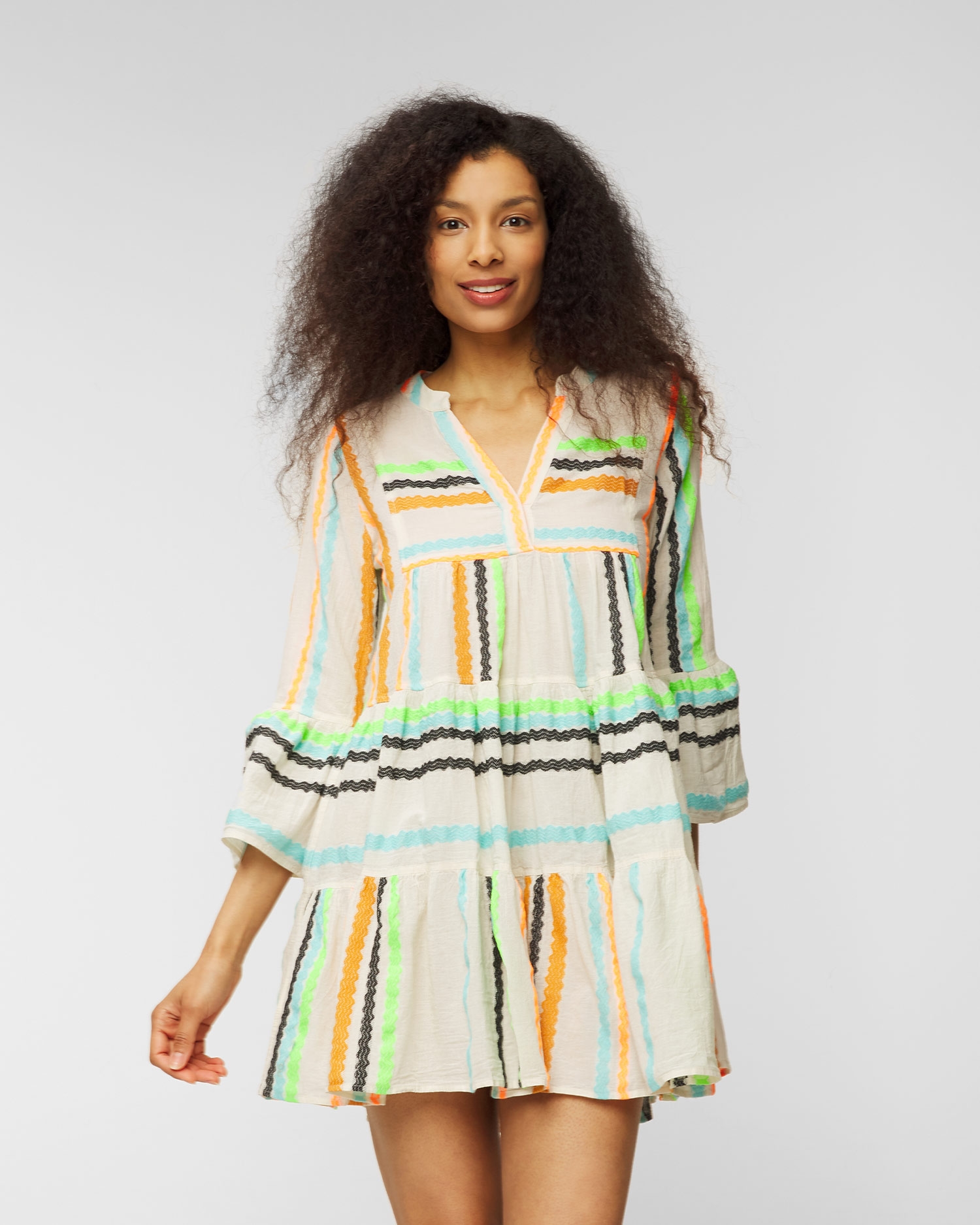 Šaty Devotion Ella z extrémne ľahkej a priedušnej bavlnenej látky, ktorá vďaka prirodzenej priedušnosti poskytne pohodlie a komfort v teplých dňoch. Šaty s voľným strihom a výstrihom do V, ktorý efektne predĺži postavu. Podmanivé jedinečným zdobením s vyšívanými vodorovnými pruhmi, ktoré jej dodávajú dovolenkový charakter. Letné šaty s 3/4 rukávmi zakončenými volánom.