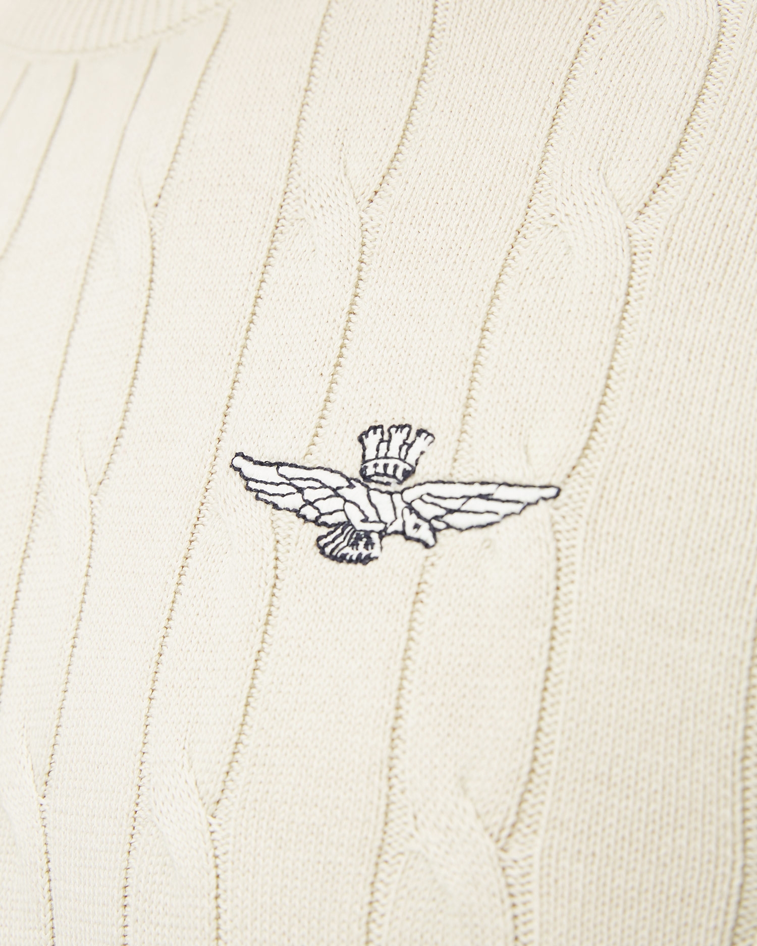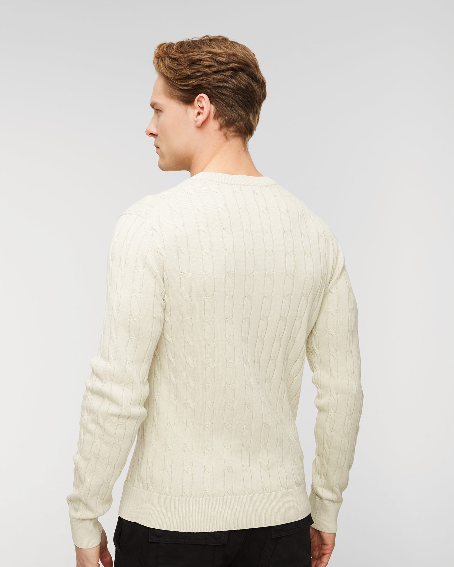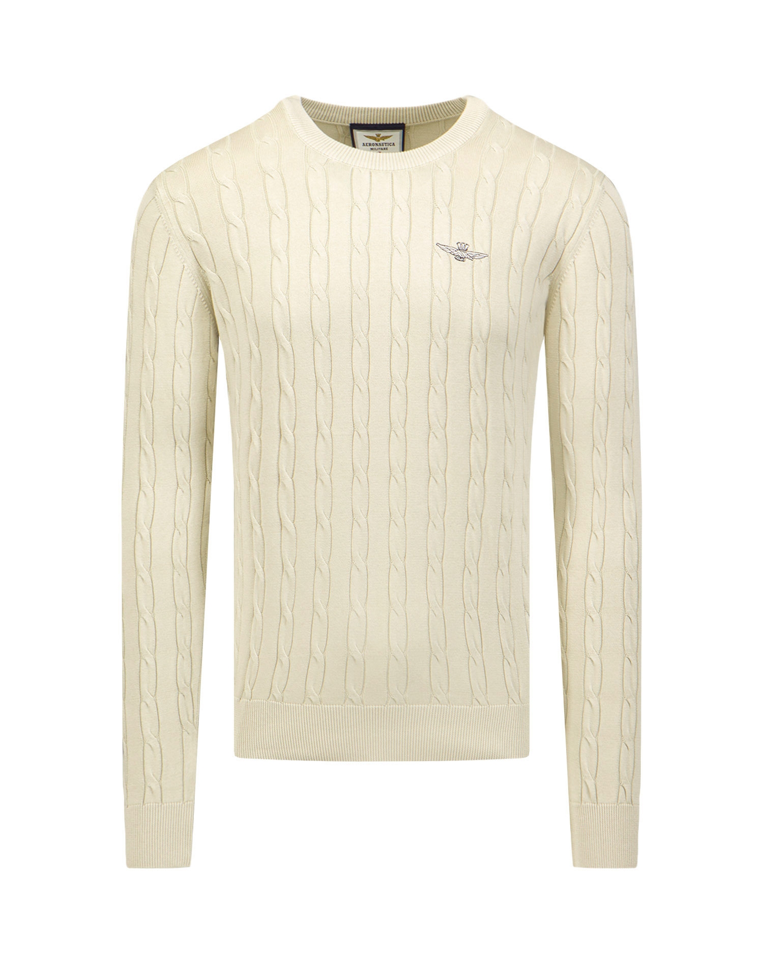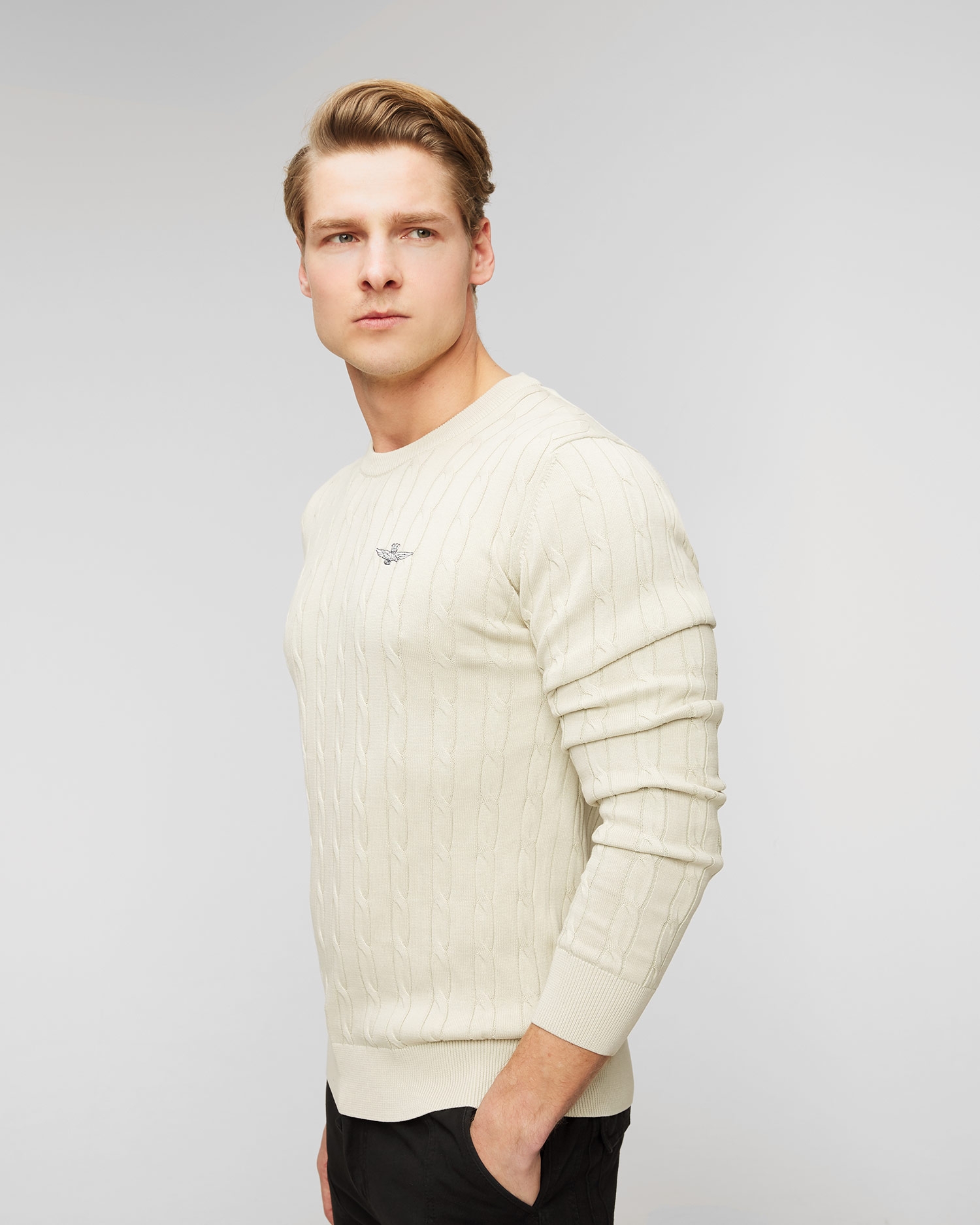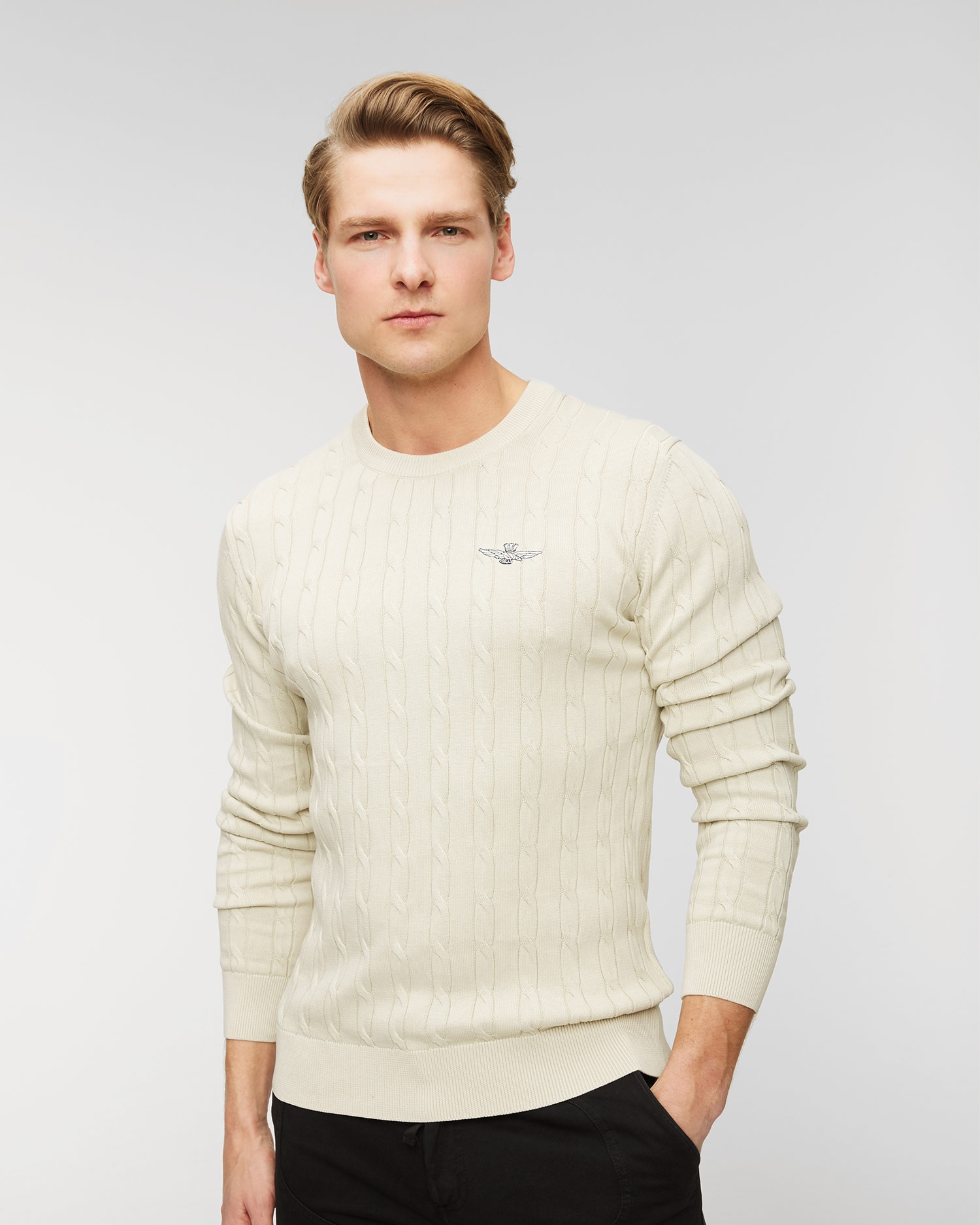 Sveter Aeronautica Militare je pohodlný model, pre každodenné nosenie. Vyrobený z vysoko kvalitného bavlneného úpletu s ozdobnou vrkočovou väzbou. Mäkký materiál sa vyznačuje prirodzenými priedušnými vlastnosťami, vďaka ktorým poskytne pohodlie pri každodennom používaní. Sveter s regulárnym strihom a oválnym výstrihom. V spodnej časti ukončené elastickým lemovaním pre lepšie prispôsobenie. Ozdobený minimalistickým logom značky na hrudi.